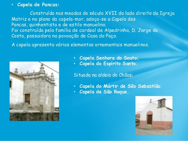 62. 62. • Capela de Pancas: Construída nas meadas do século XVII do lado direito da Igreja Matriz e no plano da capela-mor, adoça-se a Capela dos Pancas, quinhentista e de estilo manuelino. Foi construída pela família de cardeal de Alpedrinha, D. Jorge da Costa, possuidora na povoação de Casa do Paço. A capela apresenta vários elementos ornamentais manuelinos. • Capela Senhora do Souto; • Capela do Espírito Santo; Situada na aldeia do Chãos: • Capela do Mártir de São Sebastião; • Capela de São Roque.