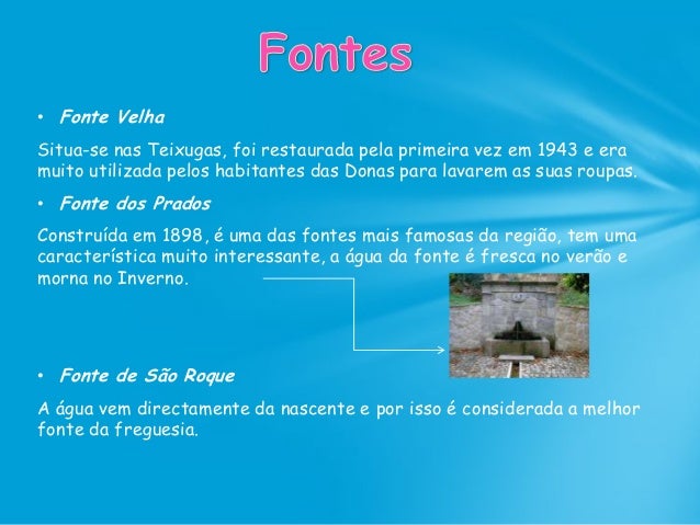 63. 63. • Fonte Velha Situa-se nas Teixugas, foi restaurada pela primeira vez em 1943 e era muito utilizada pelos habitantes das Donas para lavarem as suas roupas. • Fonte dos Prados Construída em 1898, é uma das fontes mais famosas da região, tem uma característica muito interessante, a água da fonte é fresca no verão e morna no Inverno. • Fonte de São Roque A água vem directamente da nascente e por isso é considerada a melhor fonte da freguesia.