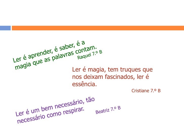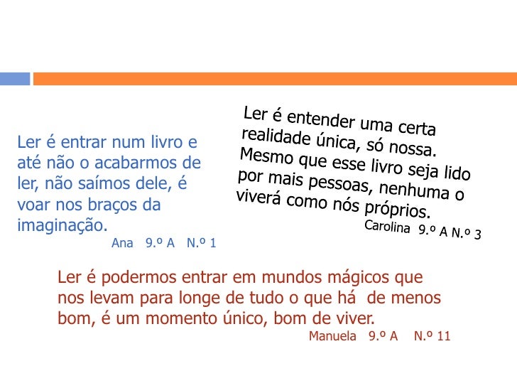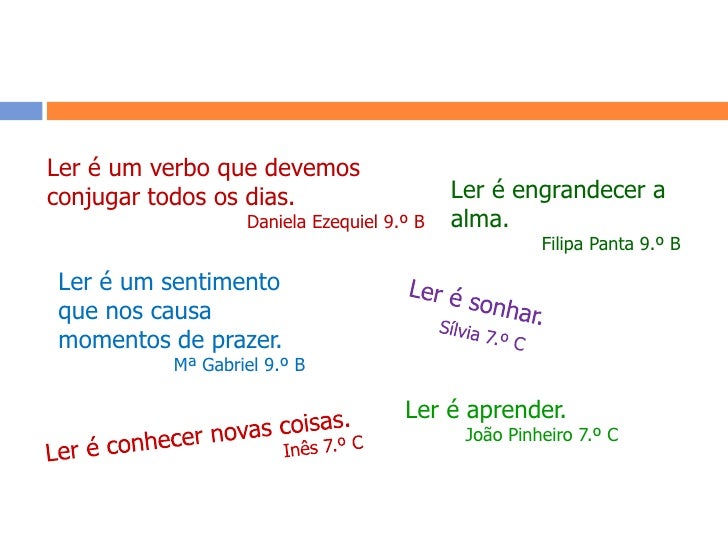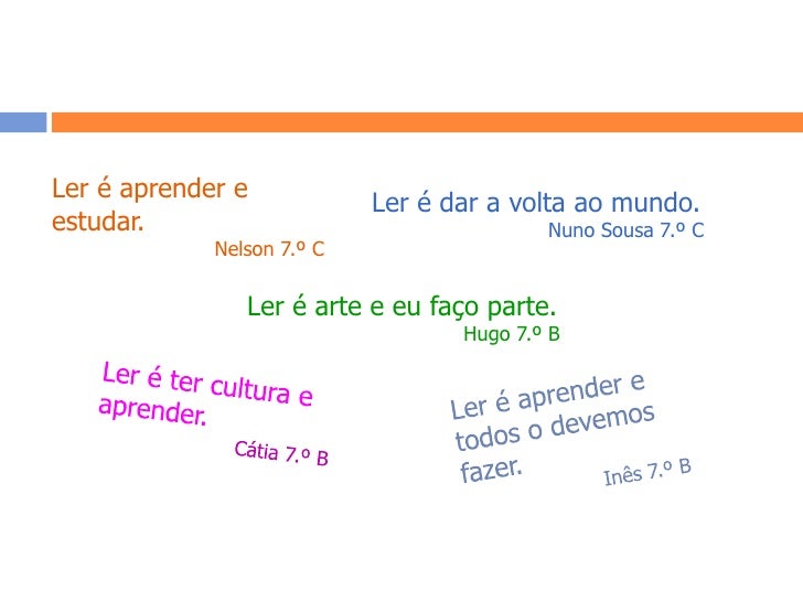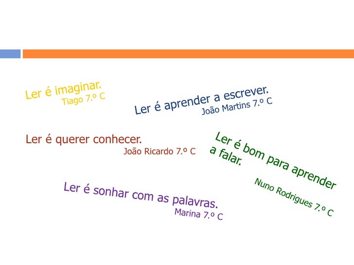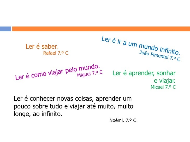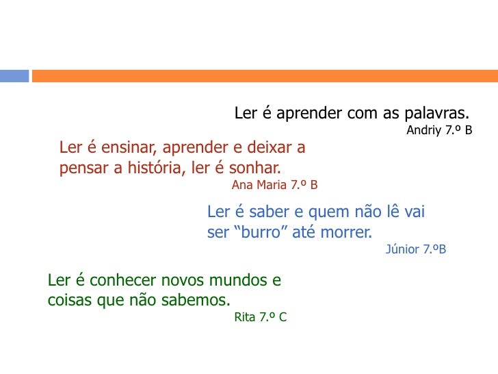 11. 11. Ler é aprender com as palavras. Andriy 7.º B Ler é ensinar, aprender e deixar a pensar a história, ler é sonhar. Ana Maria 7.º B Ler é saber e quem não lê vai ser “burro” até morrer. Júnior 7.ºBLer é conhecer novos mundos ecoisas que não sabemos. Rita 7.º C
