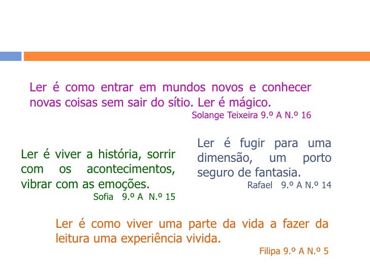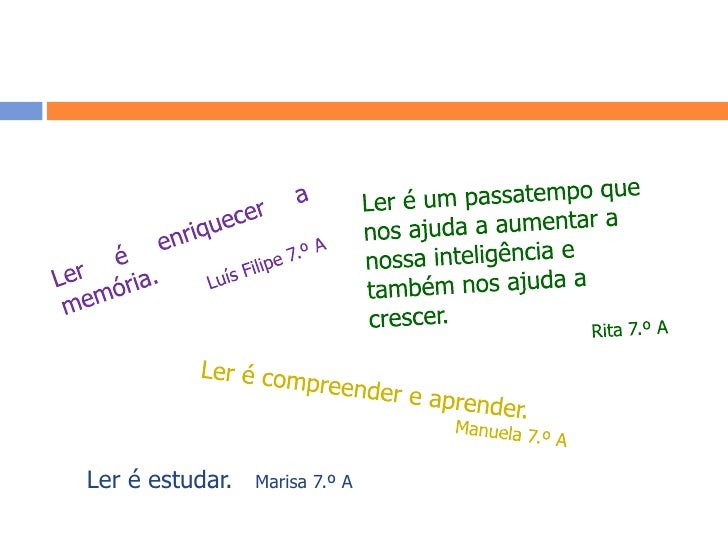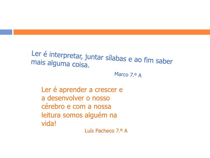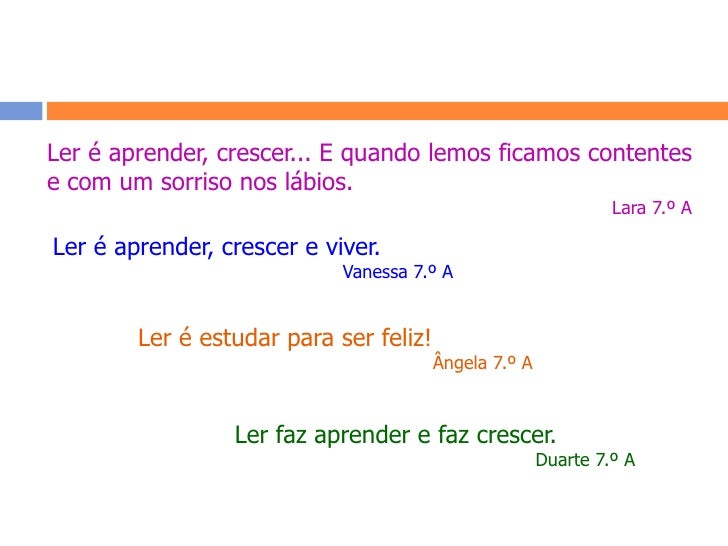 4. 4. Ler é aprender, crescer... E quando lemos ficamos contentese com um sorriso nos lábios. Lara 7.º ALer é aprender, crescer e viver. Vanessa 7.º A Ler é estudar para ser feliz! Ângela 7.º A Ler faz aprender e faz crescer. Duarte 7.º A