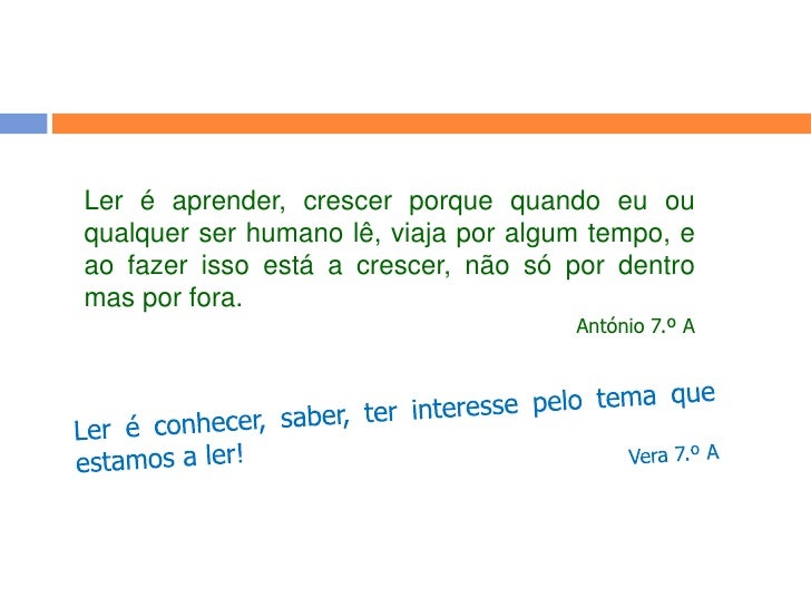 3. 3. Ler é aprender, crescer porque quando eu ouqualquer ser humano lê, viaja por algum tempo, eao fazer isso está a crescer, não só por dentromas por fora. António 7.º A