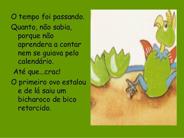 9. 9. O tempo foi passando. Quanto, não sabia, porque não aprendera a contar nem se guiava pelo calendário. Até que...crac! O primeiro ovo estalou e de lá saiu um bicharoco de bico retorcido.