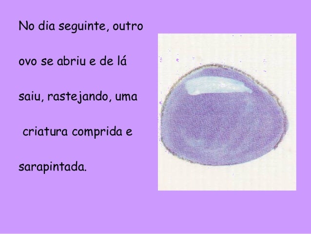11. 11. No dia seguinte, outro ovo se abriu e de lá saiu, rastejando, uma criatura comprida e sarapintada.