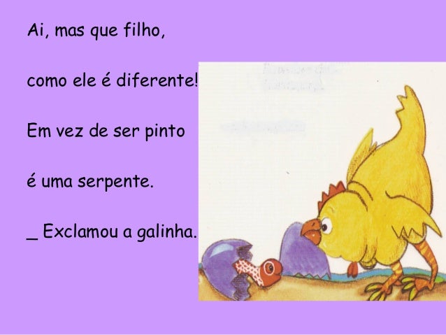 12. 12. Ai, mas que filho, como ele é diferente! Em vez de ser pinto é uma serpente. _ Exclamou a galinha.