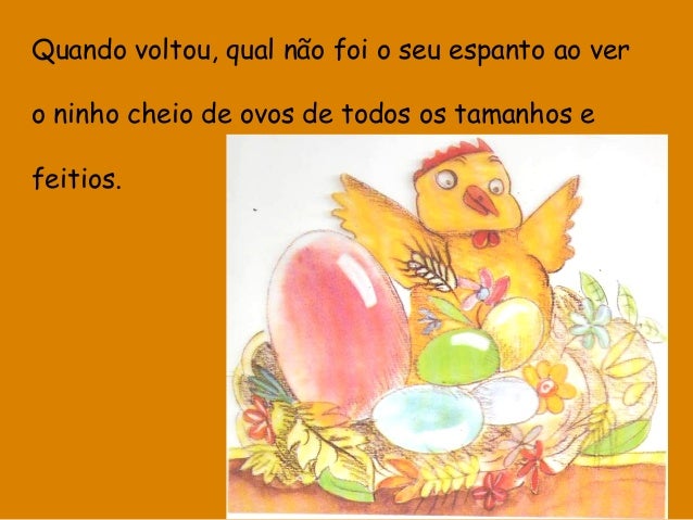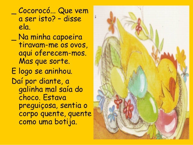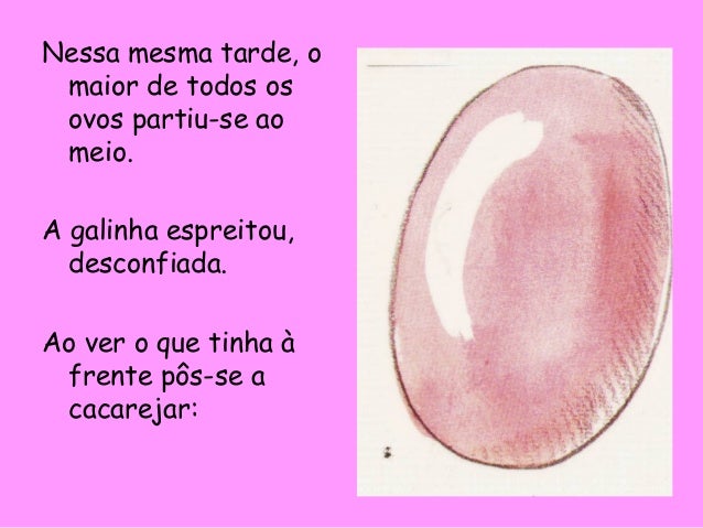 13. 13. Nessa mesma tarde, o maior de todos os ovos partiu-se ao meio. A galinha espreitou, desconfiada. Ao ver o que tinha à frente pôs-se a cacarejar: