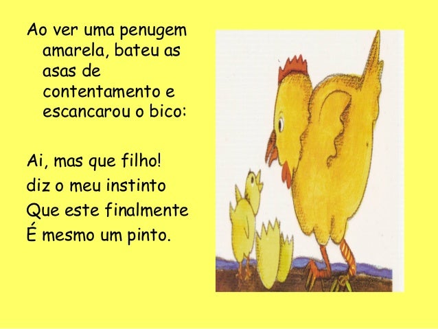 18. 18. Ao ver uma penugem amarela, bateu as asas de contentamento e escancarou o bico: Ai, mas que filho! diz o meu instinto Que este finalmente É mesmo um pinto.