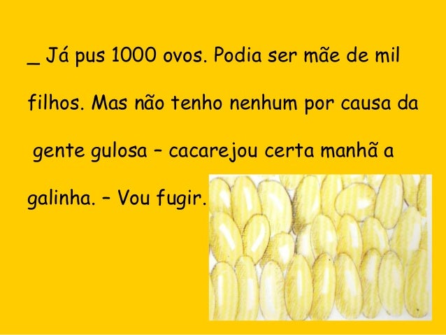3. 3. _ Já pus 1000 ovos. Podia ser mãe de mil filhos. Mas não tenho nenhum por causa da gente gulosa – cacarejou certa manhã a galinha. – Vou fugir.