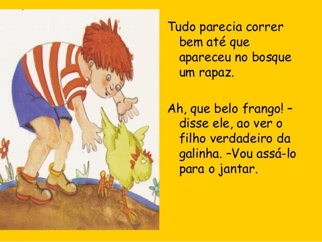32. 32. Tudo parecia correr bem até que apareceu no bosque um rapaz. Ah, que belo frango! – disse ele, ao ver o filho verdadeiro da galinha. –Vou assá-lo para o jantar.