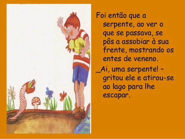 34. 34. Foi então que a serpente, ao ver o que se passava, se pôs a assobiar à sua frente, mostrando os entes de veneno. _Ai, uma serpente! – gritou ele e atirou-se ao lago para lhe escapar.