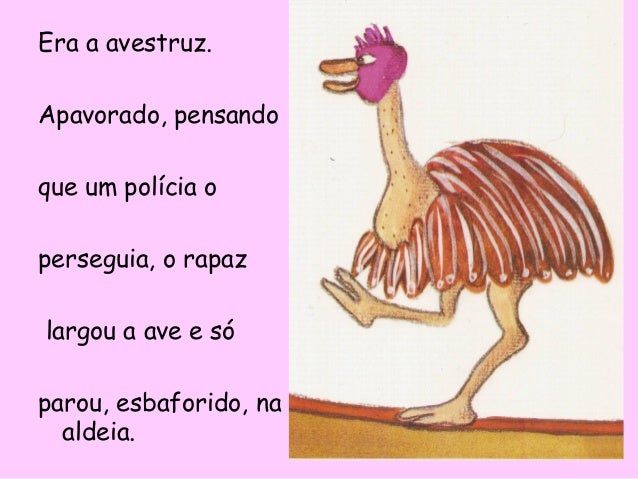 38. 38. Era a avestruz. Apavorado, pensando que um polícia o perseguia, o rapaz largou a ave e só parou, esbaforido, na aldeia.