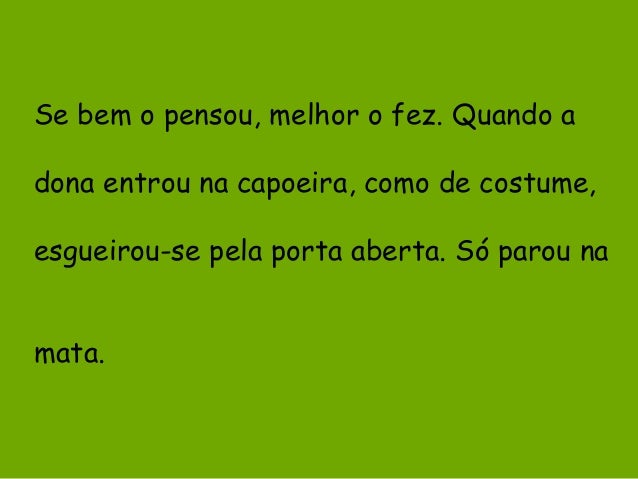4. 4. Se bem o pensou, melhor o fez. Quando a dona entrou na capoeira, como de costume, esgueirou-se pela porta aberta. Só parou na mata.