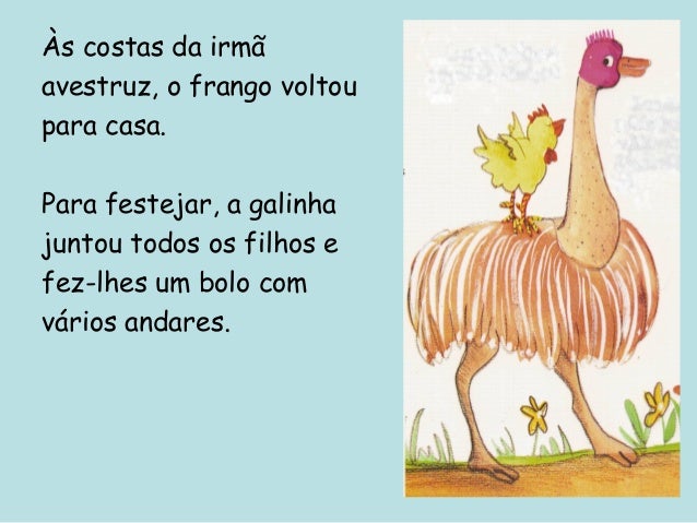 39. 39. Às costas da irmã avestruz, o frango voltou para casa. Para festejar, a galinha juntou todos os filhos e fez-lhes um bolo com vários andares.