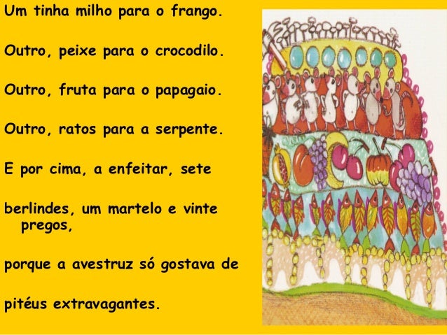 40. 40. Um tinha milho para o frango. Outro, peixe para o crocodilo. Outro, fruta para o papagaio. Outro, ratos para a serpente. E por cima, a enfeitar, sete berlindes, um martelo e vinte pregos, porque a avestruz só gostava de pitéus extravagantes.