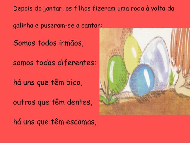 41. 41. Depois do jantar, os filhos fizeram uma roda à volta da galinha e puseram-se a cantar: Somos todos irmãos, somos todos diferentes: há uns que têm bico, outros que têm dentes, há uns que têm escamas,