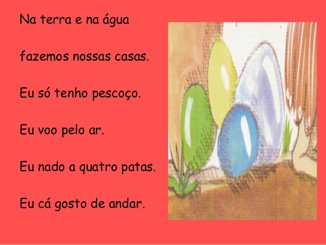 42. 42. Na terra e na água fazemos nossas casas. Eu só tenho pescoço. Eu voo pelo ar. Eu nado a quatro patas. Eu cá gosto de andar.
