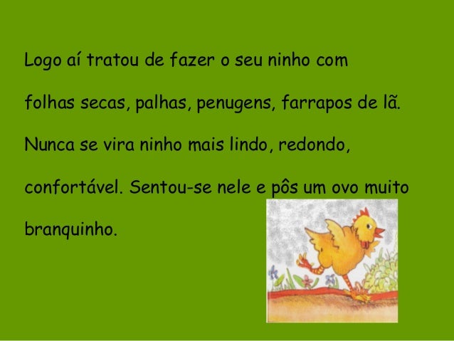 5. 5. Logo aí tratou de fazer o seu ninho com folhas secas, palhas, penugens, farrapos de lã. Nunca se vira ninho mais lindo, redondo, confortável. Sentou-se nele e pôs um ovo muito branquinho.