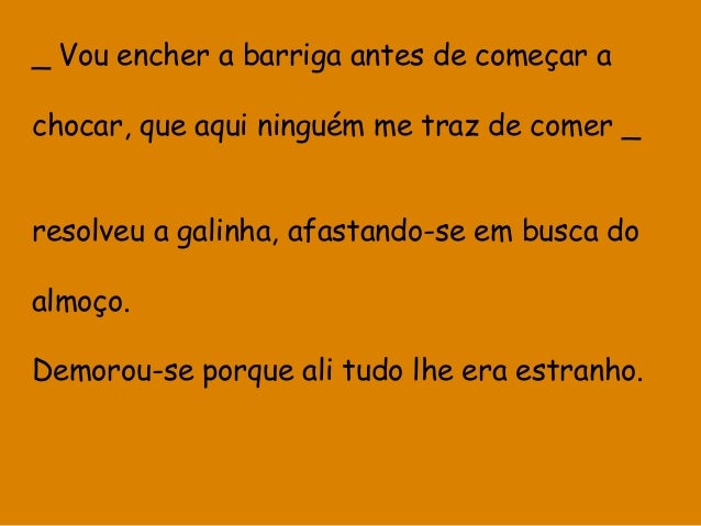 6. 6. _ Vou encher a barriga antes de começar a chocar, que aqui ninguém me traz de comer _ resolveu a galinha, afastando-se em busca do almoço. Demorou-se porque ali tudo lhe era estranho.