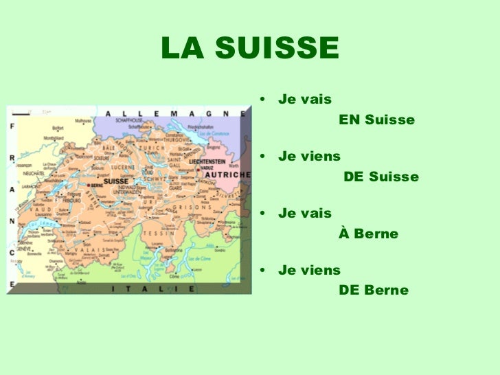 10. 10. LA SUISSE <ul><li>Je vais </li></ul><ul><li> EN Suisse </li></ul><ul><li>Je viens </li></ul><ul><li> DE Suisse </li></ul><ul><li>Je vais </li></ul><ul><li> À Berne </li></ul><ul><li>Je viens </li></ul><ul><li> DE Berne </li></ul>