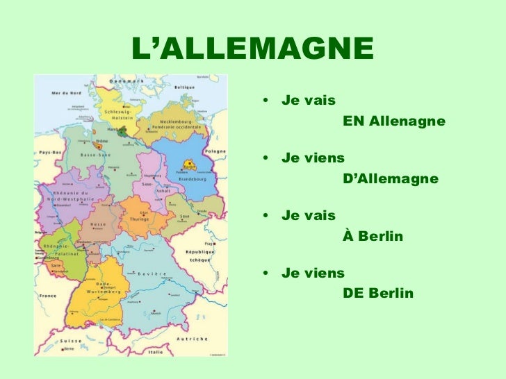 11. 11. L’ALLEMAGNE <ul><li>Je vais </li></ul><ul><li> EN Allenagne </li></ul><ul><li>Je viens </li></ul><ul><li> D’Allemagne </li></ul><ul><li>Je vais </li></ul><ul><li> À Berlin </li></ul><ul><li>Je viens </li></ul><ul><li> DE Berlin </li></ul>
