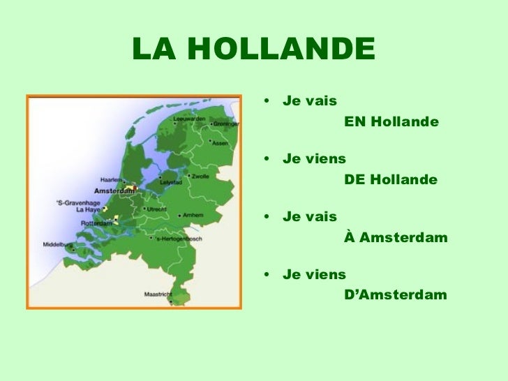 12. 12. LA HOLLANDE <ul><li>Je vais </li></ul><ul><li> EN Hollande </li></ul><ul><li>Je viens </li></ul><ul><li> DE Hollande </li></ul><ul><li>Je vais </li></ul><ul><li> À Amsterdam </li></ul><ul><li>Je viens </li></ul><ul><li> D’Amsterdam </li></ul>