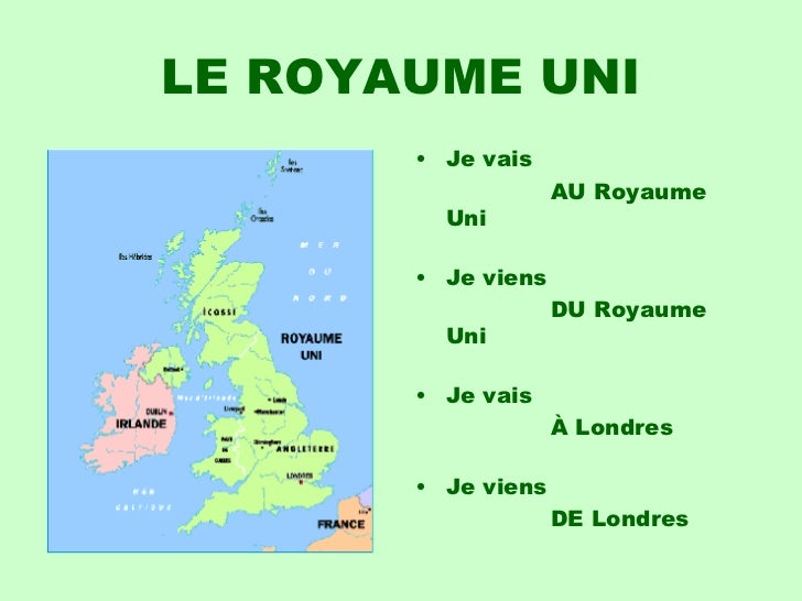 13. 13. LE ROYAUME UNI <ul><li>Je vais </li></ul><ul><li> AU Royaume Uni </li></ul><ul><li>Je viens </li></ul><ul><li> DU Royaume Uni </li></ul><ul><li>Je vais </li></ul><ul><li> À Londres </li></ul><ul><li>Je viens </li></ul><ul><li> DE Londres </li></ul>