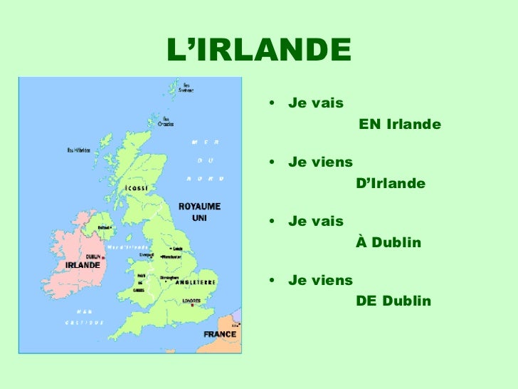 14. 14. L’IRLANDE <ul><li>Je vais </li></ul><ul><li> EN Irlande </li></ul><ul><li>Je viens </li></ul><ul><li> D’Irlande </li></ul><ul><li>Je vais </li></ul><ul><li> À Dublin </li></ul><ul><li>Je viens </li></ul><ul><li> DE Dublin </li></ul>