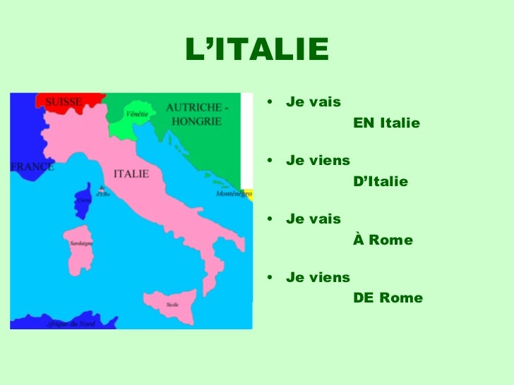 15. 15. L’ITALIE <ul><li>Je vais </li></ul><ul><li> EN Italie </li></ul><ul><li>Je viens </li></ul><ul><li> D’Italie </li></ul><ul><li>Je vais </li></ul><ul><li> À Rome </li></ul><ul><li>Je viens </li></ul><ul><li> DE Rome </li></ul>