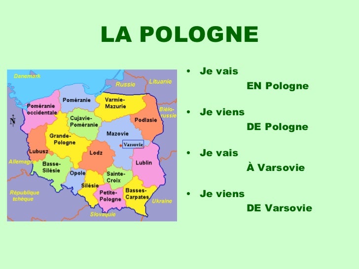 17. 17. LA POLOGNE <ul><li>Je vais </li></ul><ul><li> EN Pologne </li></ul><ul><li>Je viens </li></ul><ul><li> DE Pologne </li></ul><ul><li>Je vais </li></ul><ul><li> À Varsovie </li></ul><ul><li>Je viens </li></ul><ul><li> DE Varsovie </li></ul>