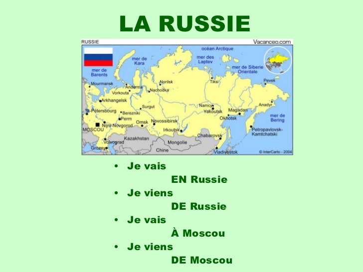 18. 18. LA RUSSIE <ul><li>Je vais </li></ul><ul><li> EN Russie </li></ul><ul><li>Je viens </li></ul><ul><li> DE Russie </li></ul><ul><li>Je vais </li></ul><ul><li> À Moscou </li></ul><ul><li>Je viens </li></ul><ul><li> DE Moscou </li></ul>