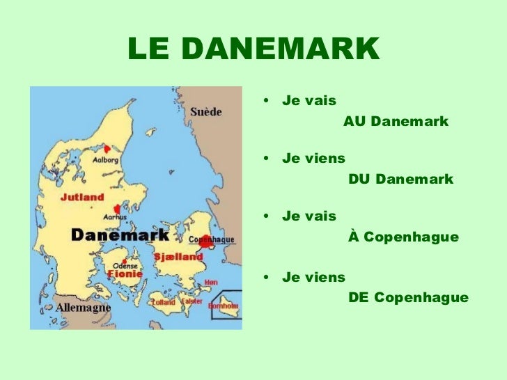 19. 19. LE DANEMARK <ul><li>Je vais </li></ul><ul><li> AU Danemark </li></ul><ul><li>Je viens </li></ul><ul><li> DU Danemark </li></ul><ul><li>Je vais </li></ul><ul><li> À Copenhague </li></ul><ul><li>Je viens </li></ul><ul><li> DE Copenhague </li></ul>