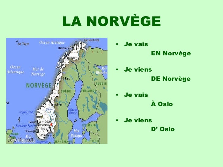 21. 21. LA NORVÈGE <ul><li>Je vais </li></ul><ul><li> EN Norvège </li></ul><ul><li>Je viens </li></ul><ul><li> DE Norvège </li></ul><ul><li>Je vais </li></ul><ul><li> À Oslo </li></ul><ul><li>Je viens </li></ul><ul><li> D’ Oslo </li></ul>