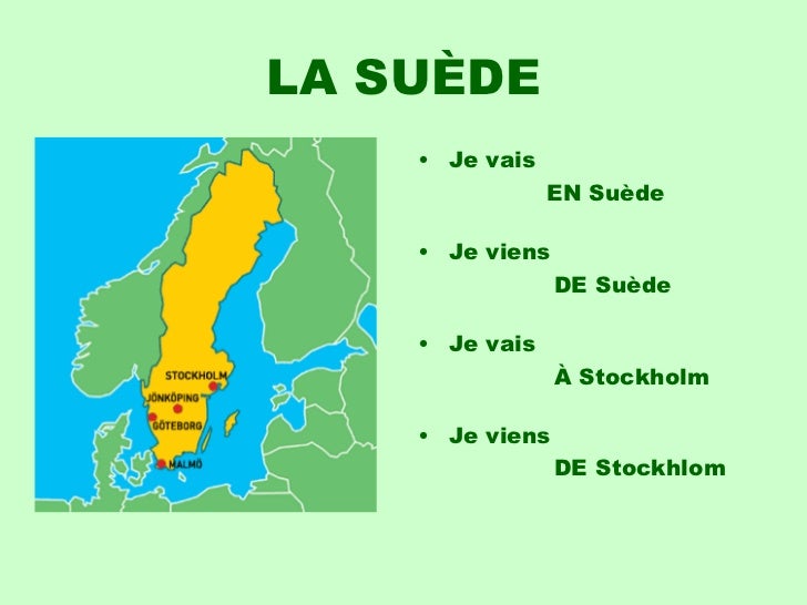 22. 22. LA SUÈDE <ul><li>Je vais </li></ul><ul><li> EN Suède </li></ul><ul><li>Je viens </li></ul><ul><li> DE Suède </li></ul><ul><li>Je vais </li></ul><ul><li> À Stockholm </li></ul><ul><li>Je viens </li></ul><ul><li> DE Stockhlom </li></ul>