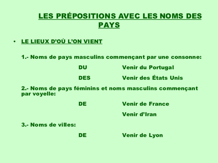 3. 3. LES PRÉPOSITIONS AVEC LES NOMS DES PAYS <ul><li>LE LIEUX D’OÙ L’ON VIENT 1.- Noms de pays masculins commençant par une consonne: DU Venir du Portugal DES Venir des États Unis 2.- Noms de pays féminins et noms masculins commençant par voyelle: DE Venir de France Venir d’Iran 3.- Noms de villes: DE Venir de Lyon </li></ul>