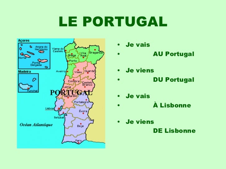 5. 5. LE PORTUGAL <ul><li>Je vais </li></ul><ul><li>AU Portugal </li></ul><ul><li>Je viens </li></ul><ul><li>DU Portugal </li></ul><ul><li>Je vais </li></ul><ul><li>À Lisbonne </li></ul><ul><li>Je viens </li></ul><ul><li> DE Lisbonne </li></ul>