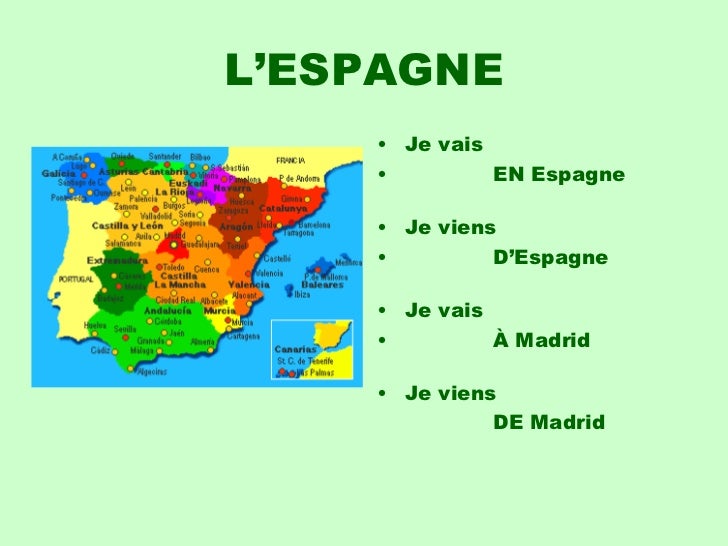 6. 6. L’ESPAGNE <ul><li>Je vais </li></ul><ul><li>EN Espagne </li></ul><ul><li>Je viens </li></ul><ul><li>D’Espagne </li></ul><ul><li>Je vais </li></ul><ul><li>À Madrid </li></ul><ul><li>Je viens </li></ul><ul><li> DE Madrid </li></ul>