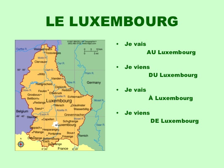 9. 9. LE LUXEMBOURG <ul><li>Je vais </li></ul><ul><li> AU Luxembourg </li></ul><ul><li>Je viens </li></ul><ul><li> DU Luxembourg </li></ul><ul><li>Je vais </li></ul><ul><li> À Luxembourg </li></ul><ul><li>Je viens </li></ul><ul><li> DE Luxembourg </li></ul>