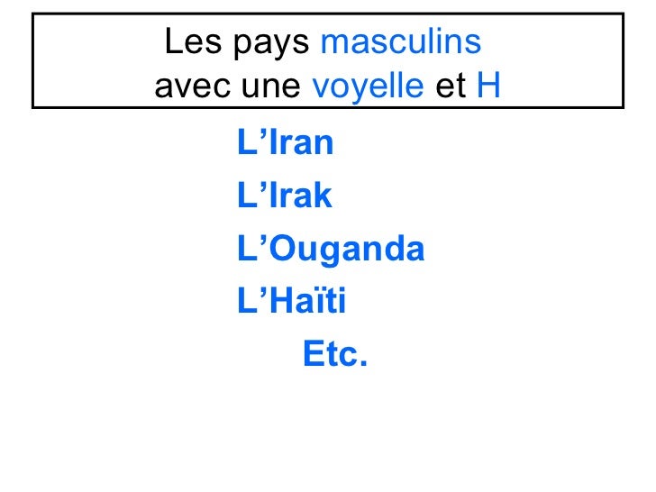Les pays masculinsavec une voyelle et H    L’Iran    L’Irak    L’Ouganda    L’Haïti        Etc.
