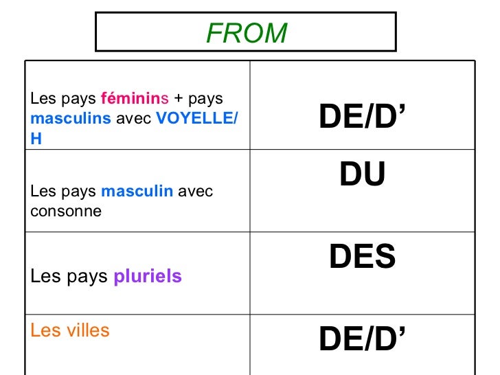 FROMLes pays féminins + paysmasculins avec VOYELLE/H                            DE/D’Les pays masculin avec               ...