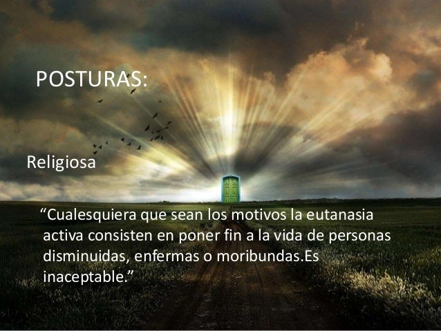 6. 6. POSTURAS:Religiosa“Cualesquiera que sean los motivos la eutanasiaactiva consisten en poner fin a la vida de personasdisminuidas, enfermas o moribundas.Esinaceptable.”