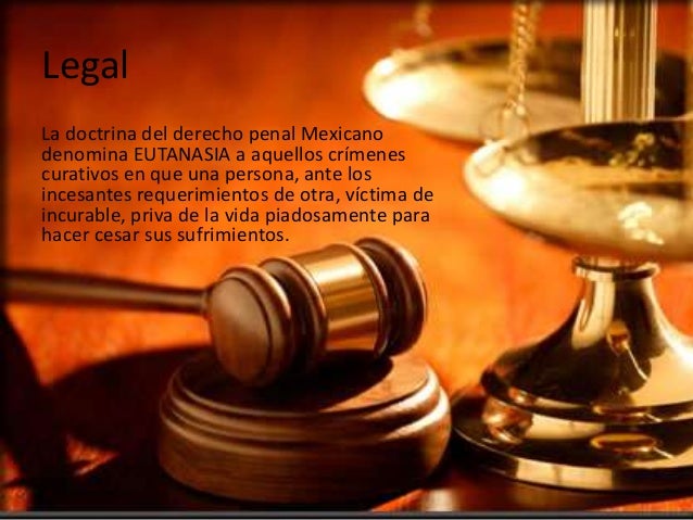 7. 7. LegalLa doctrina del derecho penal Mexicanodenomina EUTANASIA a aquellos crímenescurativos en que una persona, ante losincesantes requerimientos de otra, víctima deincurable, priva de la vida piadosamente parahacer cesar sus sufrimientos.