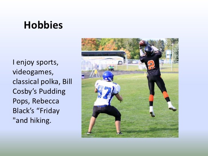6. 6. Hobbies<br />I enjoy sports, videogames, classical polka, Bill Cosby’s Pudding Pops, Rebecca Black’s “Friday "and hiking.<br />
