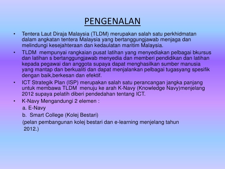 2. 2. PENGENALAN<br />TenteraLautDiraja Malaysia (TLDM) merupakansalahsatuperkhidmatandalamangkatantentera Malaysia yang bertanggungjawabmenjagadanmelindungikesejahteraandankedaulatanmaritim Malaysia.<br />TLDM mempunyairangkaianpusatlatihan yang menyediakanpelbagaibkursusdanlatihan s bertanggungjawabmenyediadanmemberipendidikandanlatihankepadapegawaidananggotasupayadapatmenghasilkansumbermanusia yang mantapdanberkualitidandapatmenjalankanpelbagaitugasyangspesifikdenganbaik,berkesandanefektif.<br />ICT Strategik Plan (ISP) merupakansalahsatuperancanganjangkapanjanguntukmembawa TLDM menujukearah K-Navy (Knowledge Navy)menjelang 2012 supayapelatihdiberipendedahantentang ICT.<br />K-Navy Mengandungi 2 elemen :<br /> a. E-Navy<br /> b. Smart College (KolejBestari)<br /> (pelanpembangunankolejbestaridan e-learning menjelangtahun<br /> 2012.)<br />