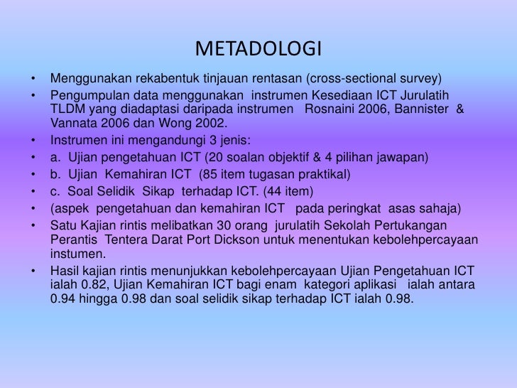 4. 4. METADOLOGI<br />Menggunakanrekabentuktinjauanrentasan (cross-sectional survey)<br />Pengumpulan data menggunakaninstrumenKesediaan ICT Jurulatih TLDM yang diadaptasidaripadainstrumenRosnaini 2006, Bannister & Vannata 2006 dan Wong 2002.<br />Instrumeninimengandungi 3 jenis:<br />a. Ujianpengetahuan ICT (20 soalanobjektif & 4 pilihanjawapan)<br />b. UjianKemahiran ICT (85 item tugasanpraktikal)<br />c. SoalSelidikSikapterhadap ICT. (44 item)<br />(aspekpengetahuandankemahiran ICT padaperingkatasassahaja)<br />SatuKajianrintismelibatkan 30 orangjurulatihSekolahPertukanganPerantisTenteraDarat Port Dickson untukmenentukankebolehpercayaaninstumen.<br />HasilkajianrintismenunjukkankebolehpercayaanUjianPengetahuan ICT ialah 0.82, UjianKemahiran ICT bagienamkategoriaplikasiialahantara 0.94 hingga 0.98 dansoalselidiksikapterhadap ICT ialah 0.98.<br />
