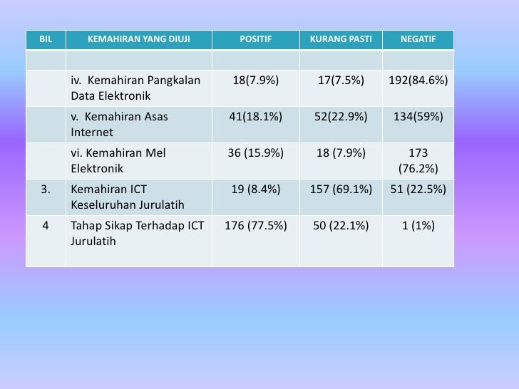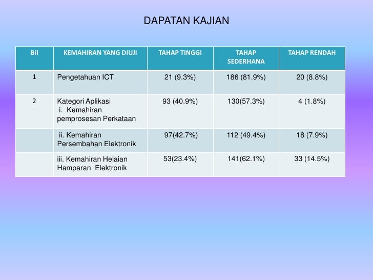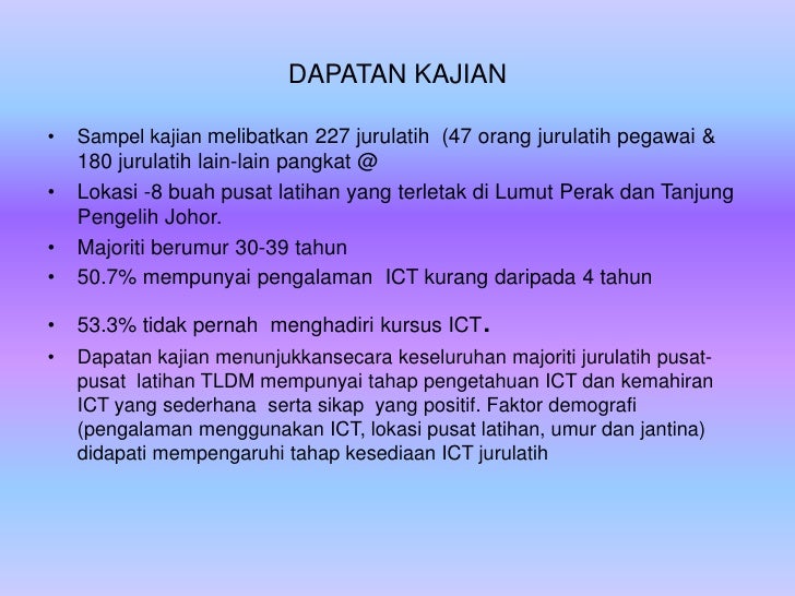 5. 5. DAPATAN KAJIAN<br />Sampelkajianmelibatkan 227 jurulatih (47 orangjurulatihpegawai & 180 jurulatih lain-lain pangkat @ <br />Lokasi -8 buahpusatlatihan yang terletakdiLumut Perak danTanjungPengelih Johor.<br />Majoritiberumur 30-39 tahun<br />50.7% mempunyaipengalaman ICT kurangdaripada 4 tahun<br />53.3% tidakpernahmenghadirikursus ICT.<br />Dapatankajianmenunjukkansecarakeseluruhanmajoritijurulatihpusat-pusatlatihan TLDM mempunyaitahappengetahuan ICT dankemahiran ICT yang sederhanasertasikap yang positif. Faktordemografi (pengalamanmenggunakan ICT, lokasipusatlatihan, umurdanjantina) didapatimempengaruhitahapkesediaan ICT jurulatih<br />