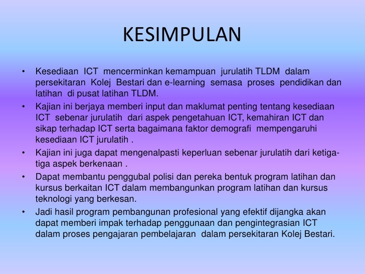 8. 8. KESIMPULAN <br />Kesediaan ICT mencerminkankemampuanjurulatih TLDM dalampersekitaranKolejBestaridan e-learning semasaprosespendidikandanlatihandipusatlatihan TLDM.<br />Kajianiniberjayamemberi input danmaklumatpentingtentangkesediaan ICT sebenarjurulatihdariaspekpengetahuan ICT, kemahiran ICT dansikapterhadap ICT sertabagaimanafaktordemografimempengaruhikesediaan ICT jurulatih .<br />Kajianinijugadapatmengenalpastikeperluansebenarjurulatihdariketiga-tigaaspekberkenaan .<br />Dapatmembantupenggubalpolisidanperekabentuk program latihandankursusberkaitan ICT dalammembangunkan program latihandankursusteknologi yang berkesan.<br />Jadihasil program pembangunanprofesional yang efektifdijangkaakandapatmemberiimpakterhadappenggunaandanpengintegrasian ICT dalamprosespengajaranpembelajarandalampersekitaranKolejBestari.<br />