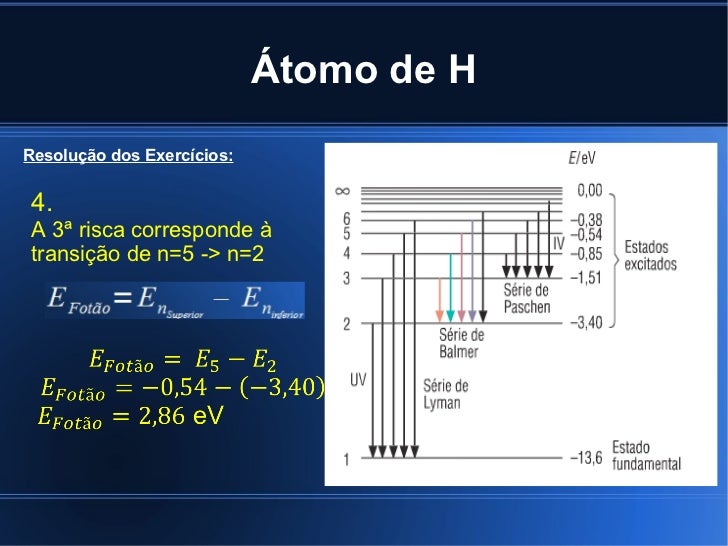 Átomo de H Resolução dos Exercícios: 4. A 3ª risca corresponde à transição de n=5 -> n=2