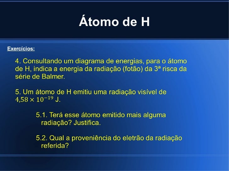 Átomo de H <ul><li>1. Uma amostra de átomos de H foi previamente excitada no 5º nível de energia. </li></ul><ul><ul><ul><l...