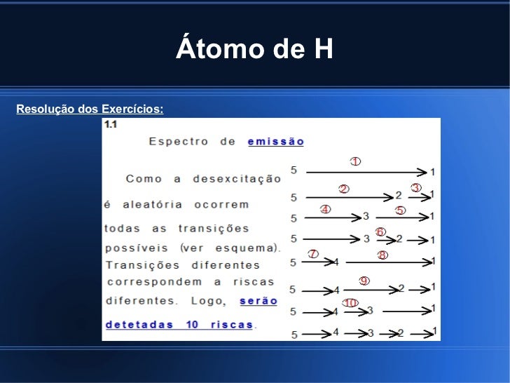 10. 10. Átomo de H Resolução dos Exercícios: 4. A 3ª risca corresponde à transição de n=5 -> n=2