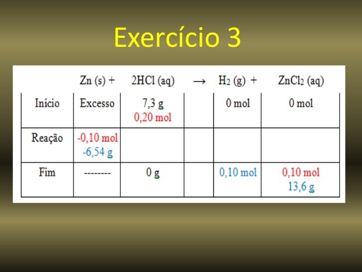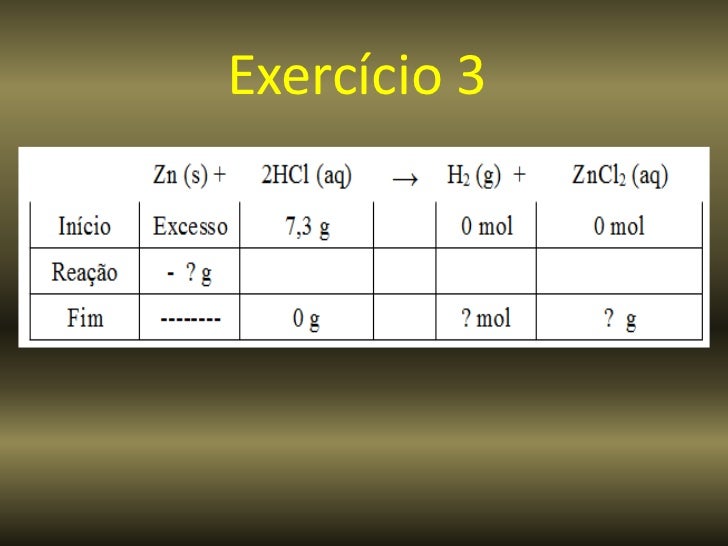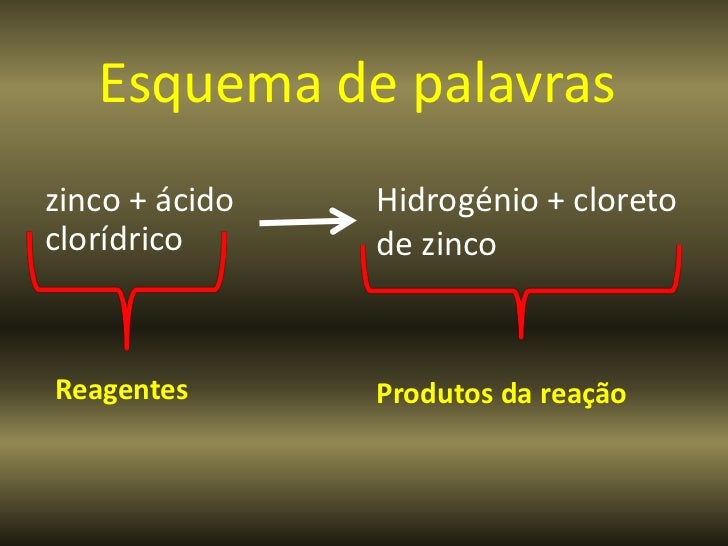 3. 3. Esquema de palavraszinco + ácido Hidrogénio + cloretoclorídrico de zincoReagentes Produtos da reação