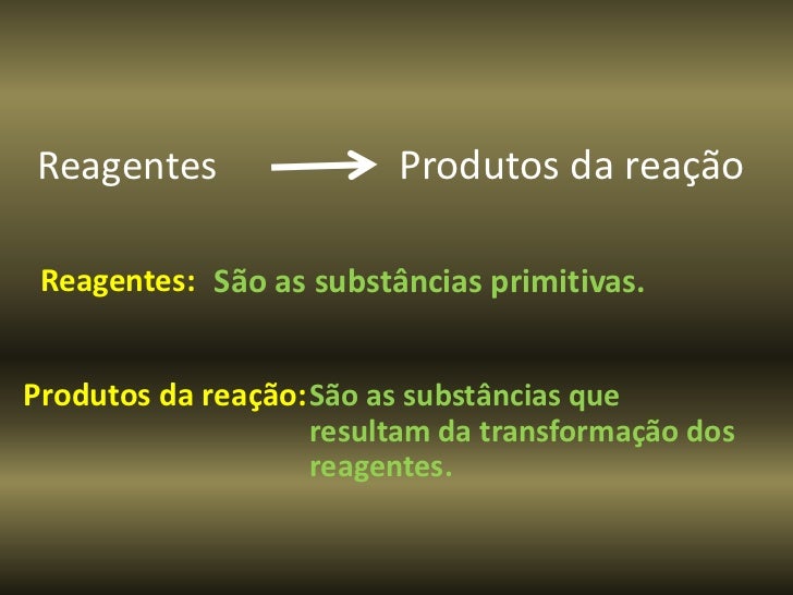 2. 2. Reagentes Produtos da reação Reagentes: São as substâncias primitivas.Produtos da reação: São as substâncias que resultam da transformação dos reagentes.